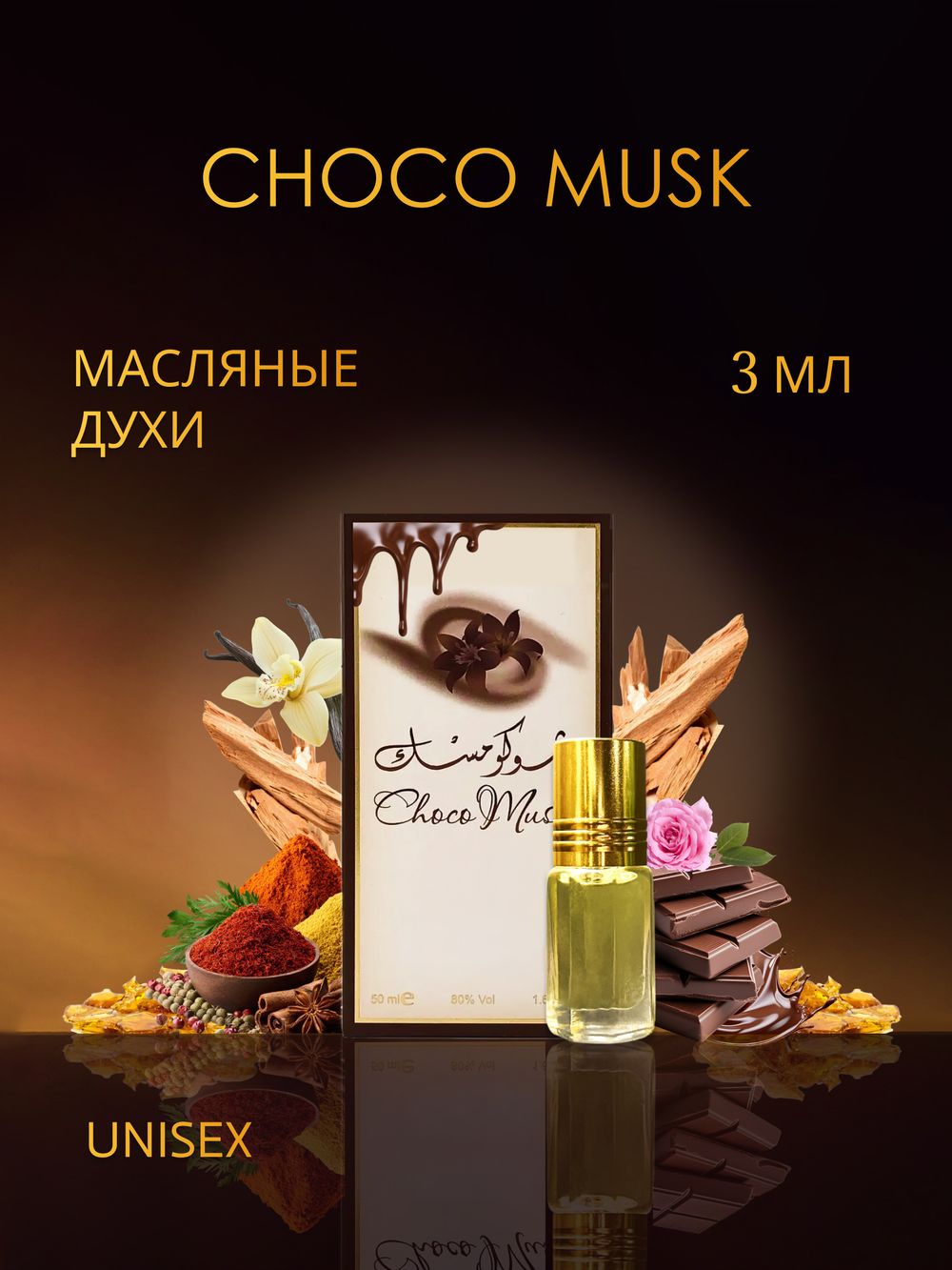 Мелодия «Альрехаб Чоко Муск» раскрывается теплым, обволакивающим шоколадом и мягким мускусом. Словно густая сливочная помадка, аромат окутывает кожу, постепенно проявляя грани ванили, согревающей корицы и деликатных специй. Легкие розовые лепестки придают сердцу неожиданную утонченность. Базовые ноты сандалового дерева, амбры и мирры создают бархатистый шлейф и продлевают звучание на несколько часов.