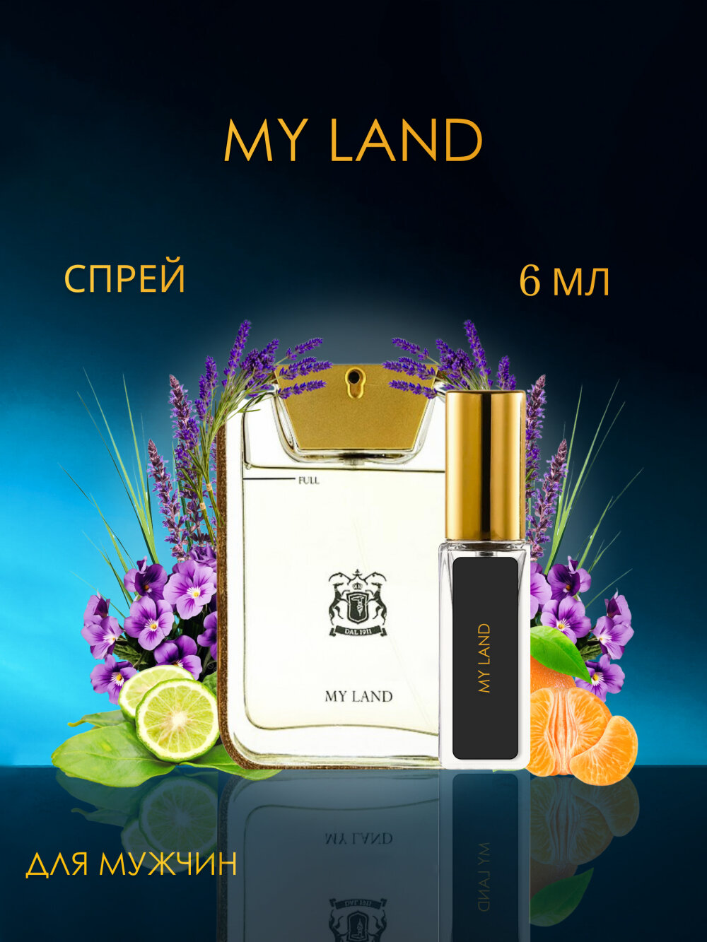 В приглушенном цитрусовом начале явно солирует бергамот, а мандарин лишь усиливает его колкую терпкость. В цветочно-пряном сердце духов утонченная лаванда и бархатная фиалка очаровывают окружающих своей благородной красотой. Ощущение захватывающего дух простора передает решительный компонент calone, умело вплетающийся в освежающее звучание вступительных нот. В завершении пирамиды «My Land» играют соблазнительные нотки кожи, окруженные сладостью бобов тонка, смолистой горечью ветивера и согревающими аккордами кашмерана.